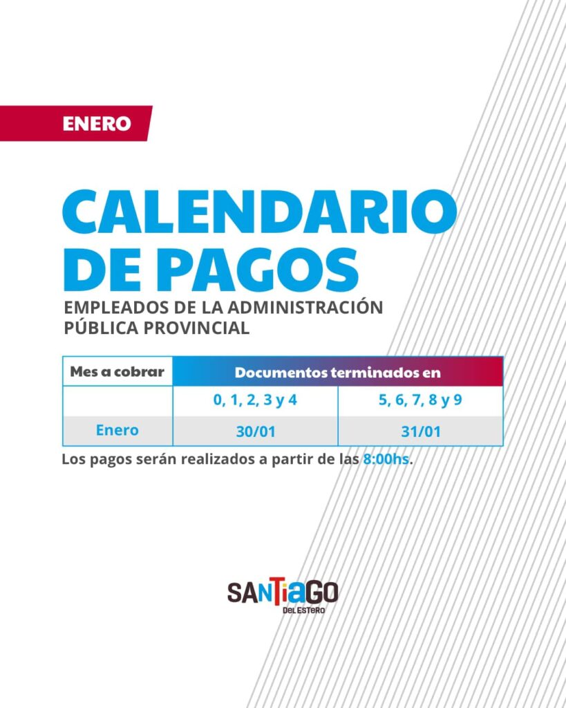 Según el calendario, el jueves 30 de enero se realizará el pago para aquellos empleados cuyos documentos nacionales de identidad finalizan en 0, 1, 2, 3 o 4. Por su parte, el viernes 31 de enero se efectuará el pago a los trabajadores cuyos DNI terminen en 5, 6, 7, 8 o 9.