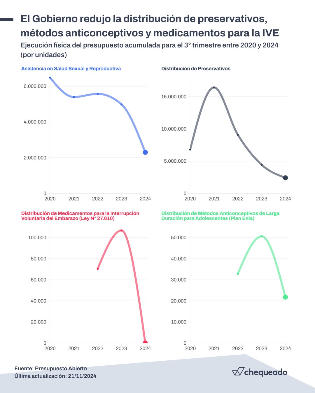 Chequeado consultó a Silvina Ramos, socióloga investigadora del Centro de Estudios de Estado y Sociedad (CEDES), quien explicó el impacto de esta situación: “La drástica e importante reducción en la cantidad de insumos distribuidos en la Argentina por parte del Gobierno nacional va a traer consecuencias negativas importantes en la vida y el bienestar de las mujeres”.