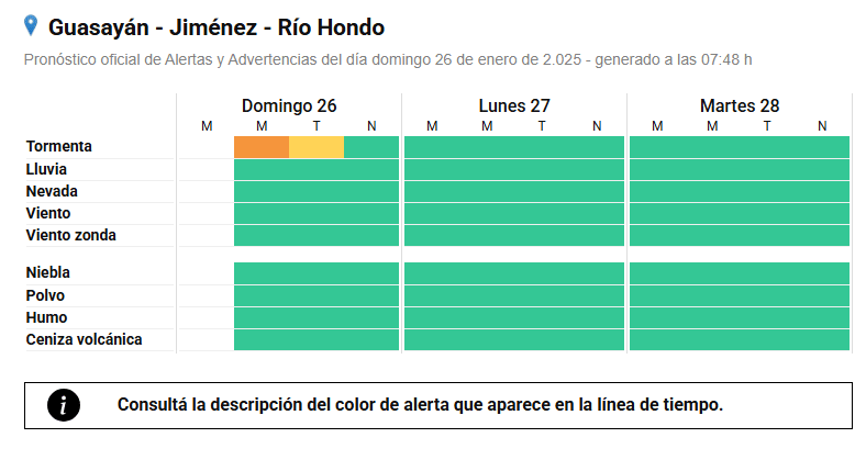 Durante la mañana el área será afectada por lluvias y tormentas, algunas localmente fuertes. Las mismas estarán acompañadas por ráfagas, caída de granizo, fuerte actividad eléctrica y fundamentalmente abundante caída de agua en cortos períodos. Se prevén valores de precipitación acumulada entre 30 y 80 mm, pudiendo ser superados en forma puntual.