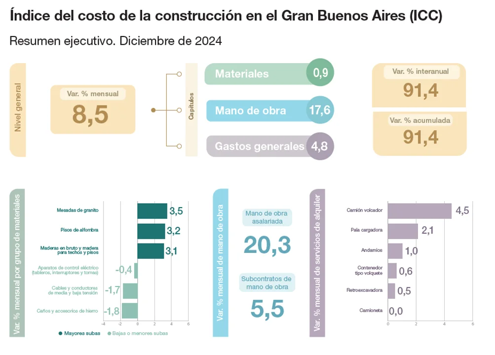 El costo de la construcción (ICC) subió 8,5% en diciembre último como consecuencia de los aumentos salariales.