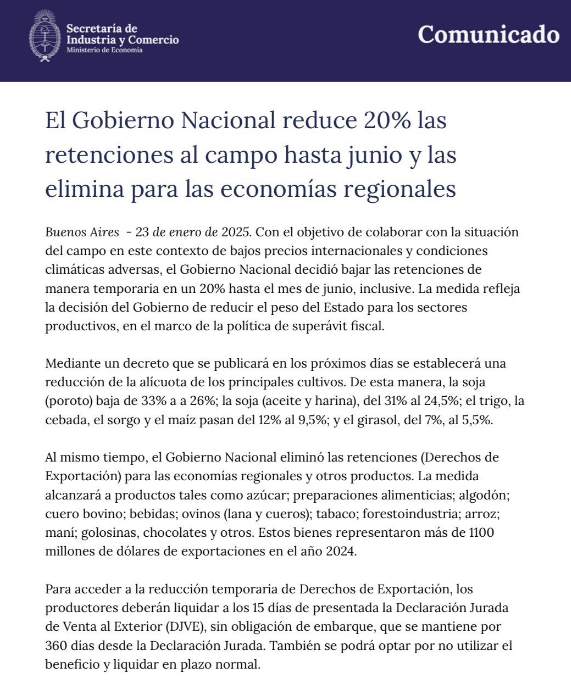 El Gobierno nacional precisó este jueves la eliminación de retenciones a las economías regionales y la baja de los derechos de exportación para todos los cultivos hasta junio próximo. Al hacer el anuncio en la Casa Rosada, el ministro de Economía, Luis Caputo, destacó que “este gobierno vino a bajar impuestos”.