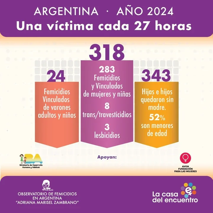 Desde el 1 de enero al 31 de diciembre de 2024, se produjeron 283 femicidios, lesbicidios, ocho trans/travesticidios y 24 femicidios vinculados de varones, según el informe anual del Observatorio de Femicidios en Argentina “Adriana Marisel Zambrano” que dirige La Casa del Encuentro.