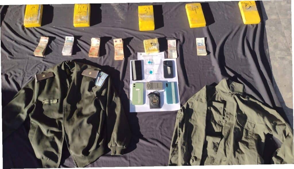 Durante el control vehicular, los efectivos interceptaron una camioneta Toyota Hilux ocupada por los cuatro individuos. El conductor se identificó como miembro activo de Gendarmería, mostrando su credencial e intentando continuar el viaje. La actitud sospechosa motivó la intervención de la Justicia Federal y el registro del vehículo. El can antinarcóticos «Maia» marcó una mochila en la caja del rodado, donde se hallaron cinco paquetes tipo “ladrillo” envueltos en cinta amarilla, que contenían cocaína de alta pureza.