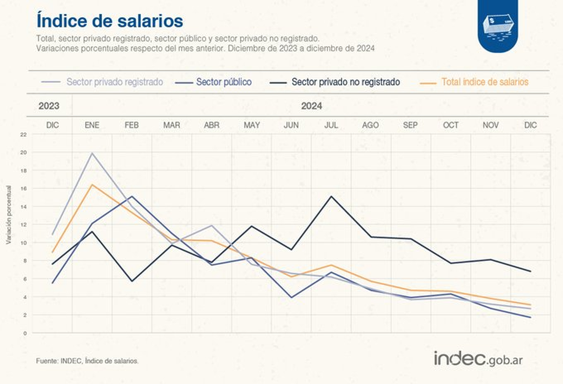 En términos interanuales, el Índice de salarios mostró una suba de 145,5%, como consecuencia de los incrementos de 147,5% en el sector privado registrado, 119,3% en el sector público y 196,7% en el sector privado no registrado.