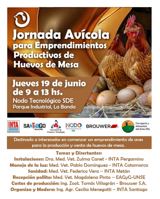 El próximo jueves 19 de junio, de 9 a 13 horas, se llevará a cabo la Jornada Avícola para Emprendimientos Productivos de Huevo de Mesa en el Nodo Tecnológico SDE, ubicado en el Parque Industrial de La Banda.