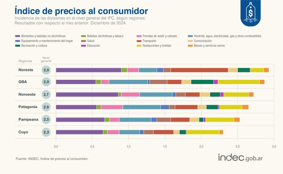 La división con mayor incidencia en el nivel general fue Alimentos y bebidas no alcohólicas (2,2%) en cinco regiones, por los aumentos en Carnes y derivados, Pan y cereales y Leche, productos lácteos y huevos; mientras que en GBA, la incidencia más alta se registró en Restaurantes y hoteles (4,6%).