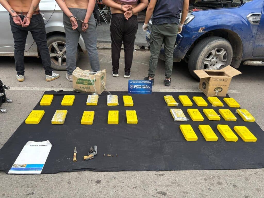 Tras concretarse la detención, el personal policial realizó una requisa mediante el empleo de scaner y perros antinarcóticos, lo que permitió dar con 24 ladrillos rectangulares compactos de color amarillo, un cuchillo y un revólver calibre 22 con 7 cartuchos en el tambor.