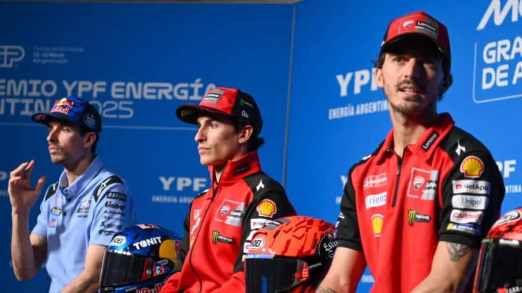 El piloto español Marc Márquez, de Ducati Lenovo Team, junto con Francesco Bagnaia, de Ducati Lenovo Team, y Alex Márquez…