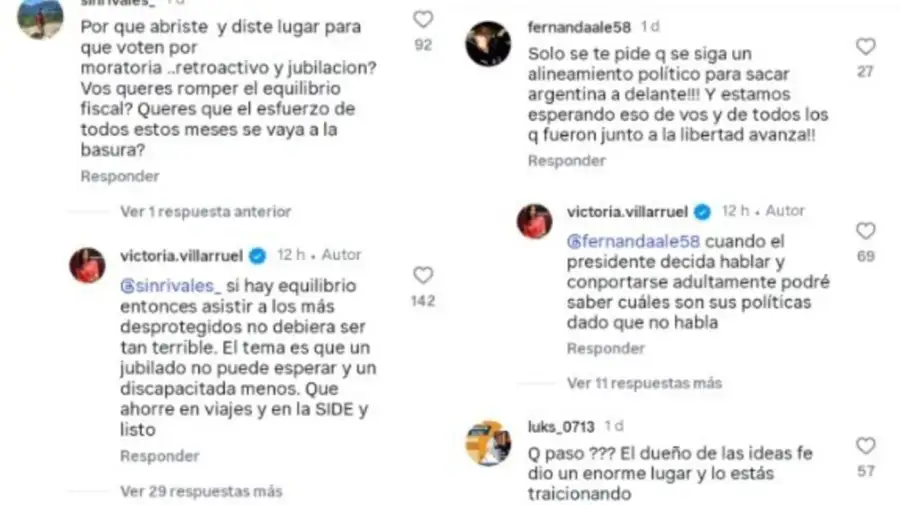 Tras la sesión en la Cámara Alta, las críticas no tardaron en llegar desde el entorno presidencial. En un acto posterior en la Bolsa de Comercio de Buenos Aires, el propio Milei calificó a Villarruel de “traidora”, mientras que la ministra de Seguridad, Patricia Bullrich, le recriminó “que se ponga del lado de la gente”. Como respuesta, el viernes por la noche la vicepresidenta recurrió a su cuenta de Instagram para defender su accionar y lanzar duros cuestionamientos al mandatario. “Que ahorre en viajes y en la SIDE y listo”, escribió en uno de los mensajes.
