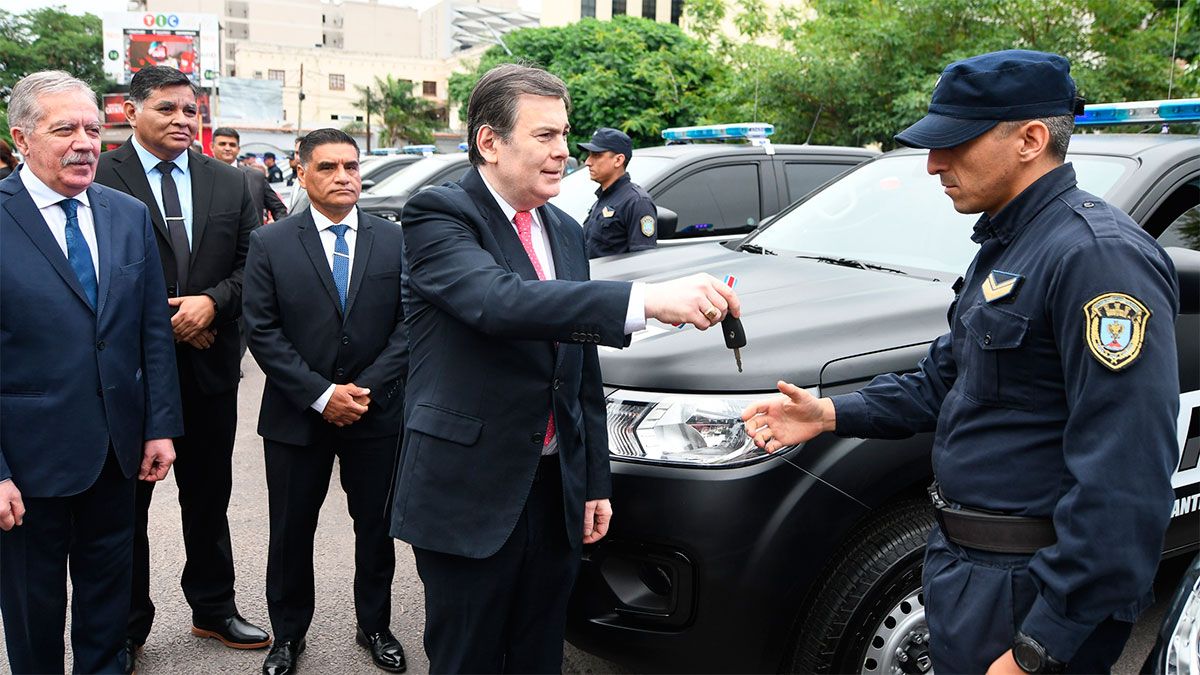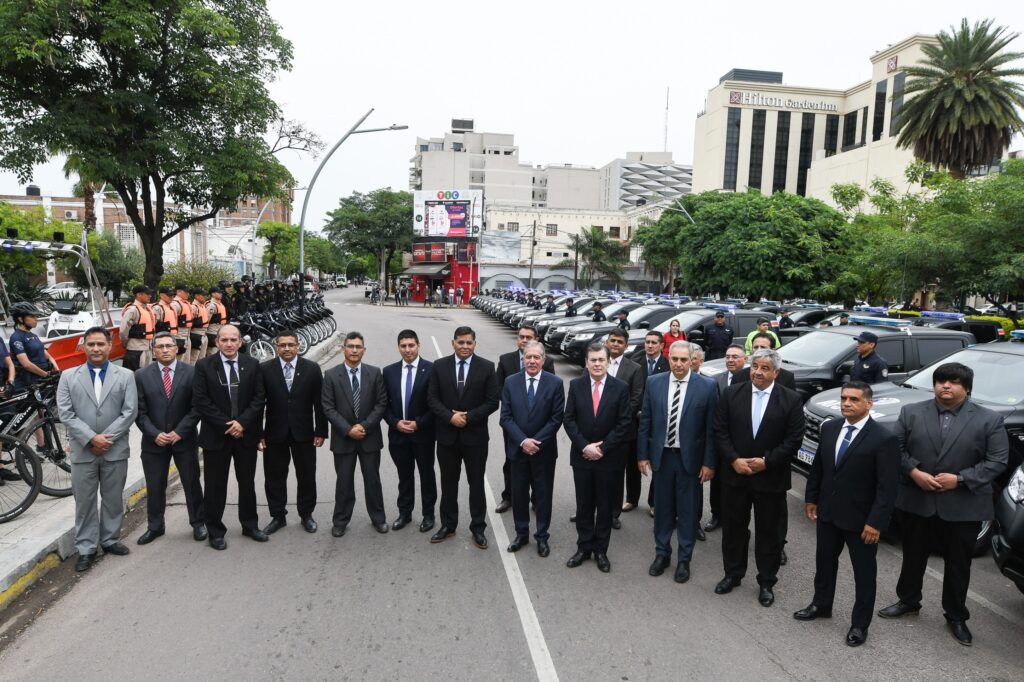 La ceremonia se realizó frente a Casa de Gobierno, donde el mandatario estuvo acompañado por el jefe de Gabinete, Elías Suárez; el ministro de Gobierno, Marcelo Barbur; el secretario de Seguridad, Marcelo Pato; el jefe de Policía, Daniel Humberto Loto y el subjefe, Laureano Silva, entre otros miembros de las fuerzas.